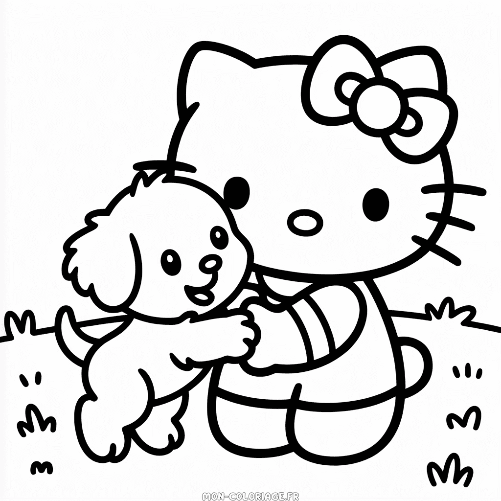 Coloriage Hello Kitty avec un chiot, découvrez la douce scène où Hello Kitty partage un moment de tendresse avec son adorable chiot. Imprimez et coloriez ce dessin gratuit Hello Kitty avec un chiot pour enfant. Image PNG de haute qualité, en noir et blanc, optimisée pour impression A4 en PDF.