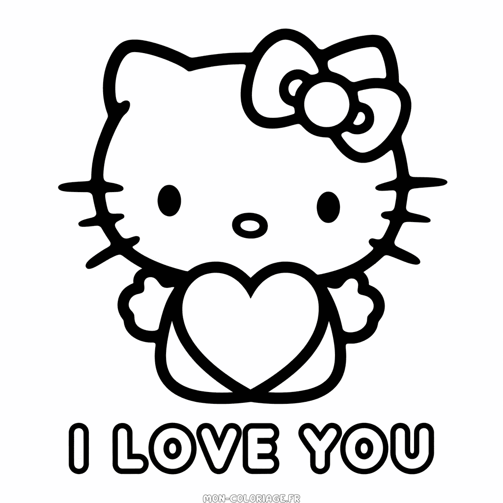 Coloriage Hello Kitty Je T’aime, ce dessin représente Hello Kitty exprimant tout son amour avec un joli cœur. Cette scène touchante ravira les enfants fans du célèbre personnage et les invitera à exprimer leurs sentiments amicaux tout en coloriant. Imprimez et coloriez ce dessin gratuit Hello Kitty Je T’aime pour enfant. Image PNG de haute qualité, en noir et blanc, optimisée pour impression A4 en PDF.
