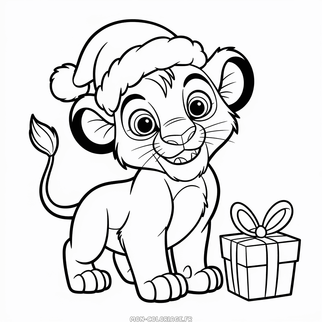 Coloriage Le Roi Lion Noël, découvrez une scène festive où les personnages bien-aimés du Roi Lion se rassemblent pour célébrer Noël avec joie et convivialité. Imprimez et coloriez ce dessin gratuit Le Roi Lion Noël pour enfant. Image PNG de haute qualité, en noir et blanc, optimisée pour impression A4 en PDF.